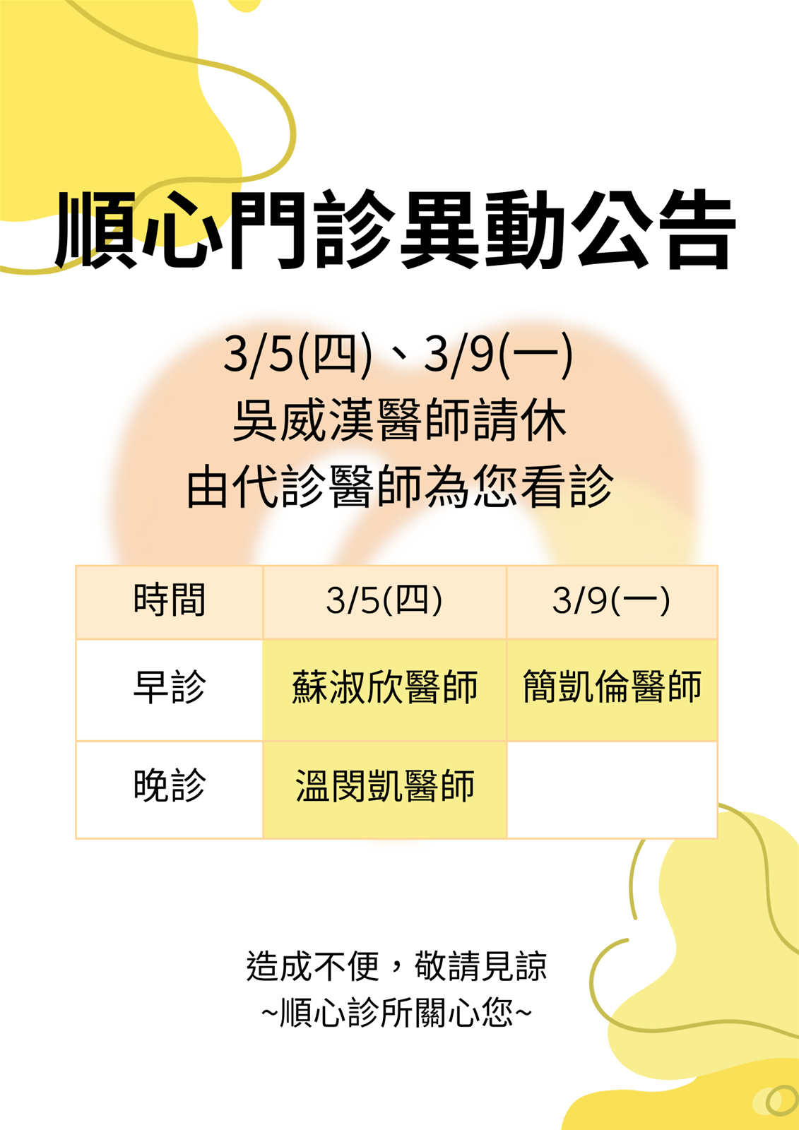 門診異動公告 吳威漢醫師休假代診