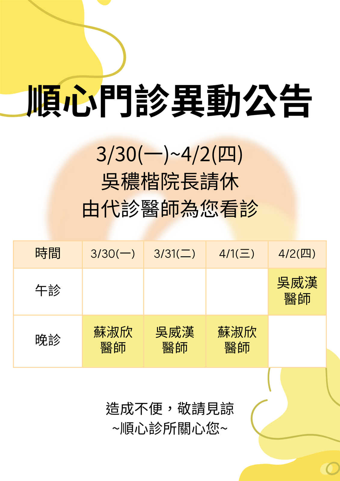 門診異動公告 吳穠楷院長休假代診