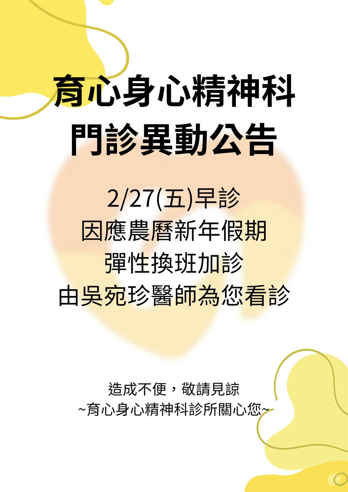 • 門診異動公告 新年彈性換班加診 2026/01/13