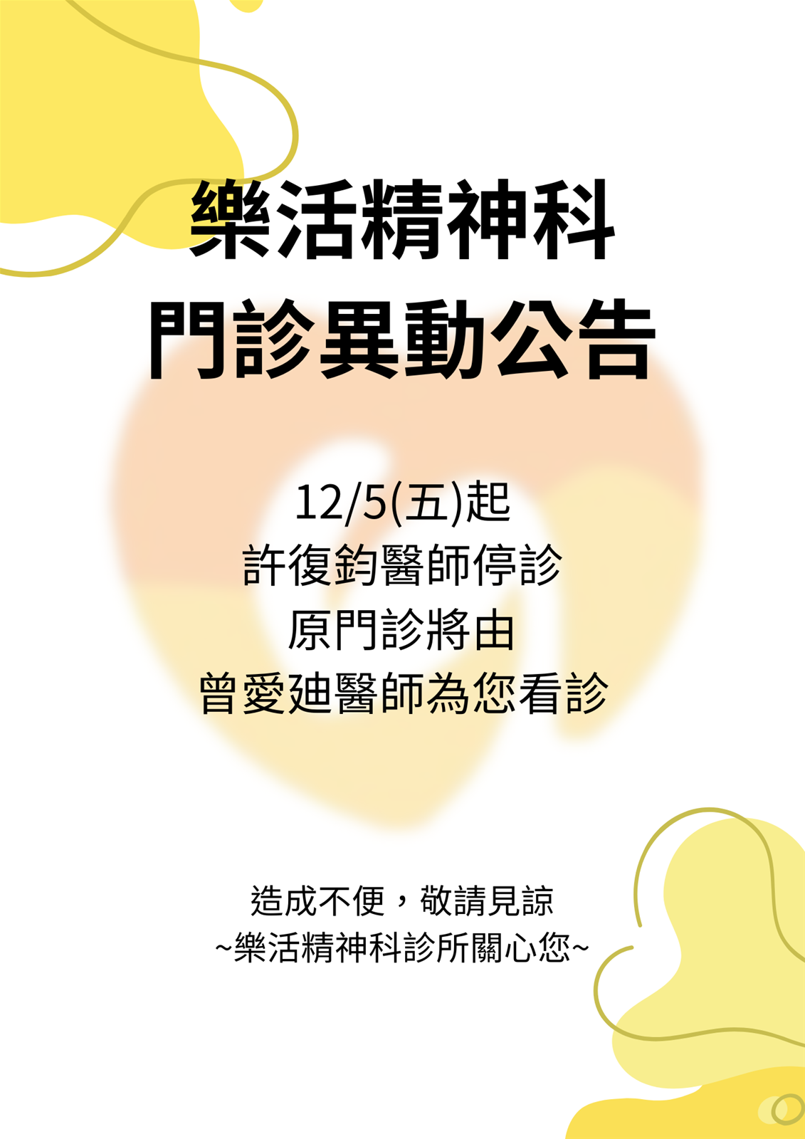 門診異動公告 12/5(五)起 許復鈞醫師停診