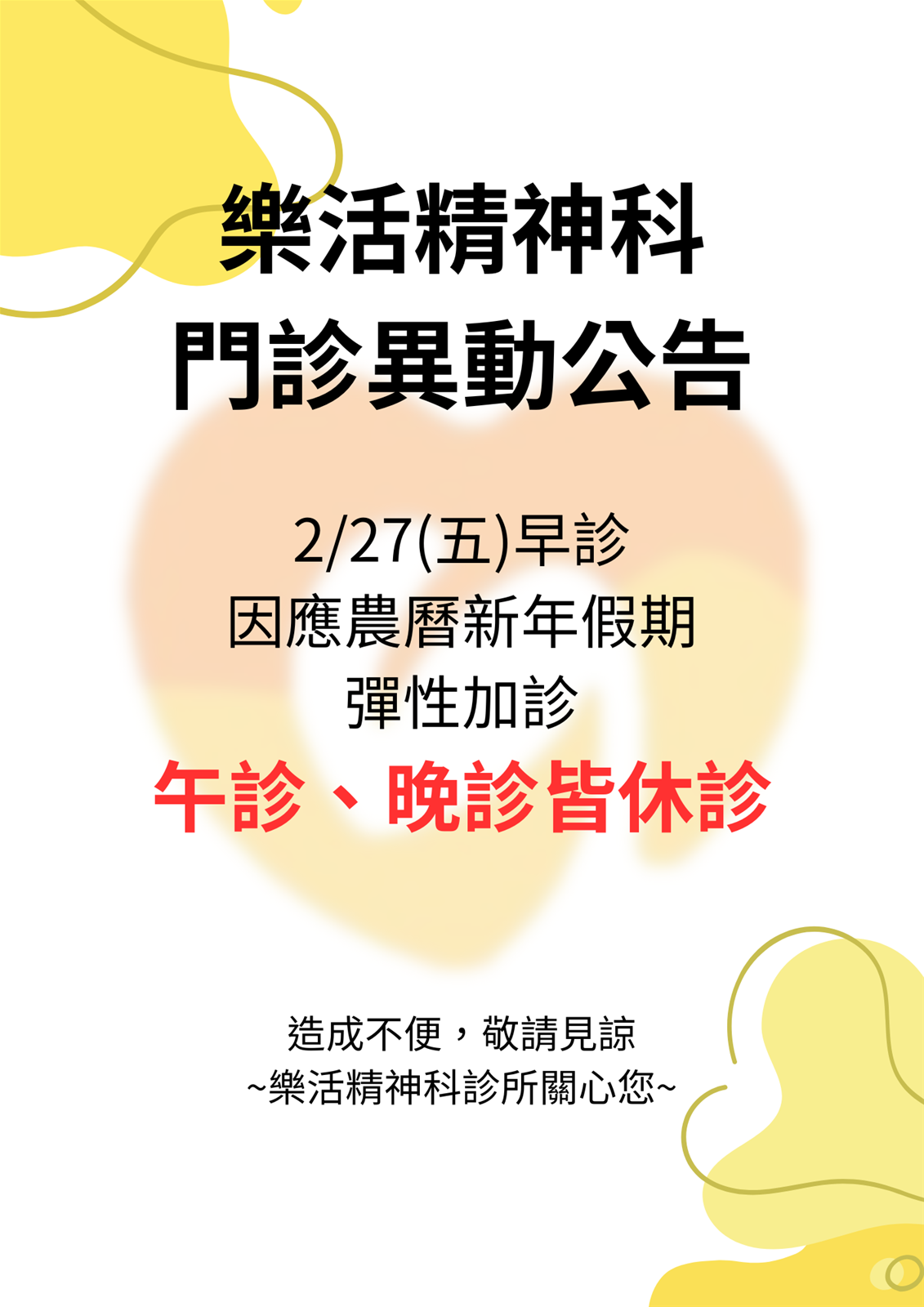 門診異動公告 新年彈性換班加診